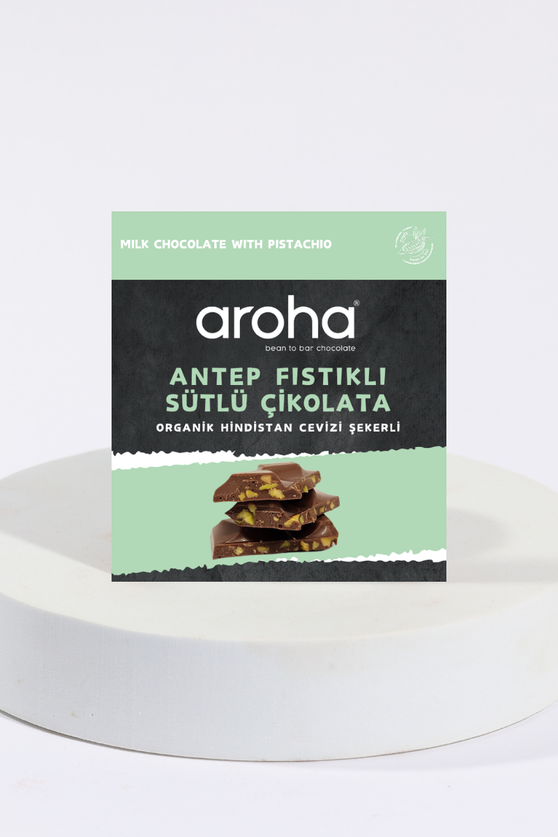 Bean to bar çikolata yöntemi ile üretilen, hiçbir katkı ve koruyucu içermeyen Aroha Çikolata çeşitlerine bir yenisi daha eklendi. Rafine şeker içermeyen, organik hindistan cevizi şekeri ile hazırlanmış sütlü çikolata Antep fıstığı parçacıkları ile.