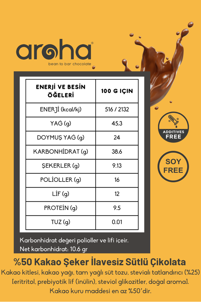 Ingredients: Cacao mass, cacao butter, whole fat milk powder, stevia sweetener (%25) [erythritol, prebiotic fiber (inulin, steviol glycosides, natural flavour]. Cacao solids min 50%.
