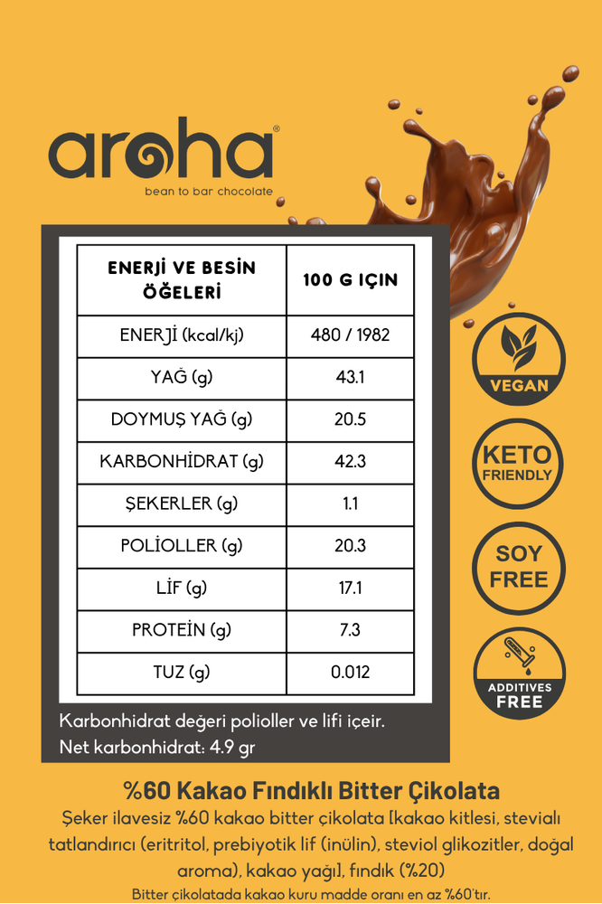 İçindekiler: Şeker İlavesiz %60 Kakao Bitter Çikolata [kakao kitlesi, stevialı tatlandırıcı (eritritol, prebiyotik lif (inülin), steviol glikozitler, doğal aroma), kakao yağı], Fındık (%20). Bitter çikolatada kakao kuru maddesi en az %60.