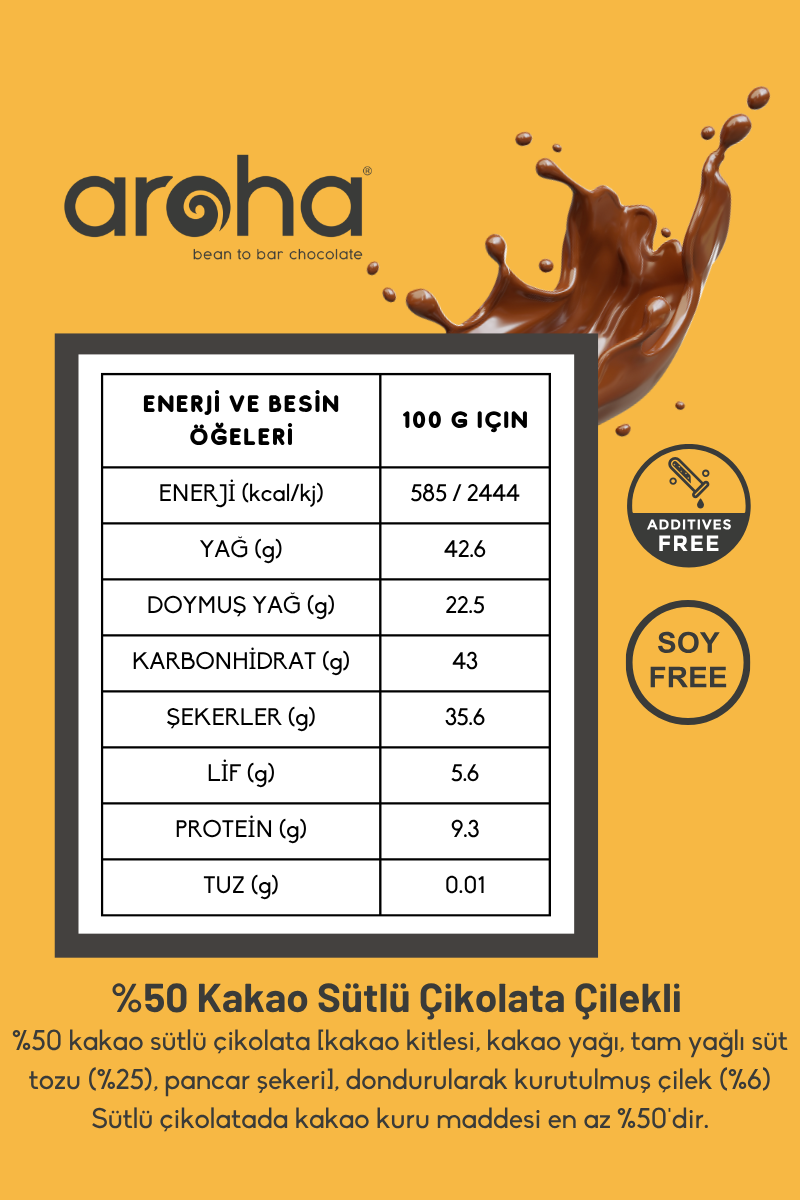 İçindekiler: %50 Kakao Sütlü Çikolata (kakao kitlesi, kakao yağı, tam yağlı süt tozu (%25), pancar şekeri), Dondurularak kurutulmuş çilek (%6). Sütlü çikolatada kakao kuru maddesi en az %50.