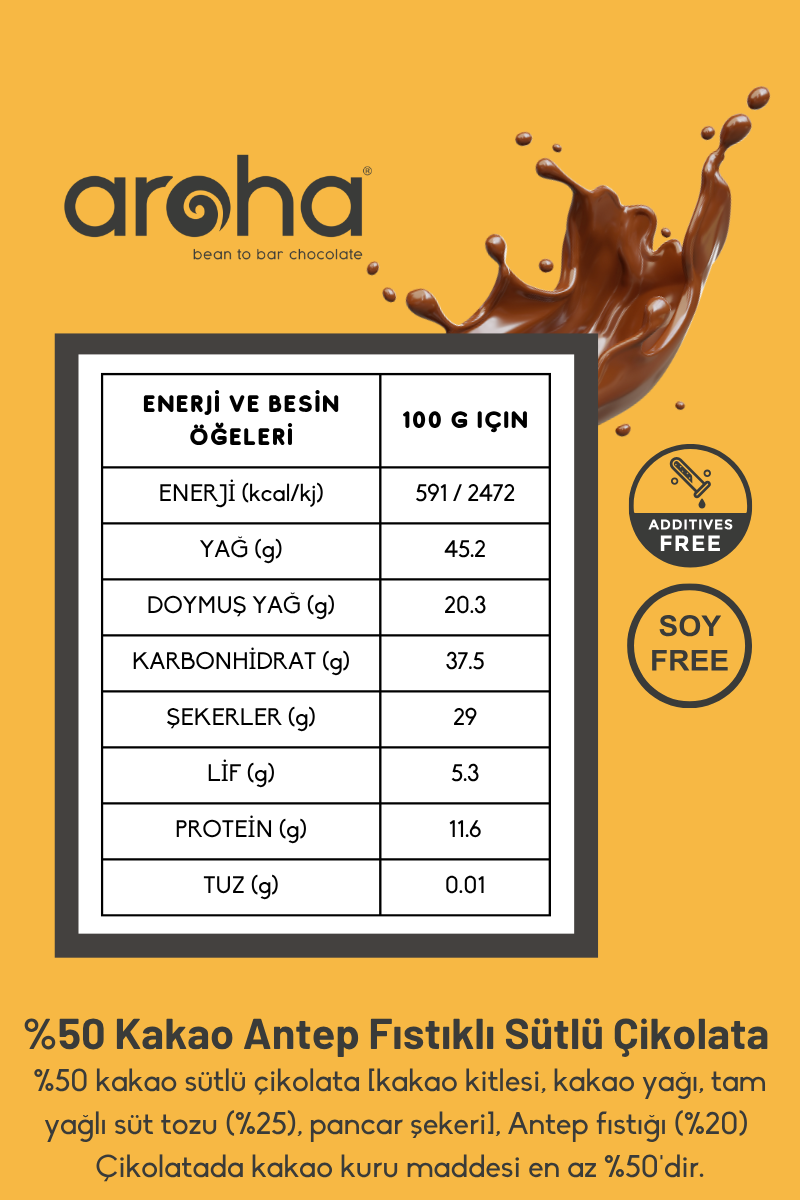 İçindekiler: %50 Kakao Sütlü Çikolata (kakao kitlesi, kakao yağı, tam yağlı süt tozu (%25), pancar şekeri), Antep fıstığı (%20). Sütlü Çikolatada kakao kuru maddesi en az %50.